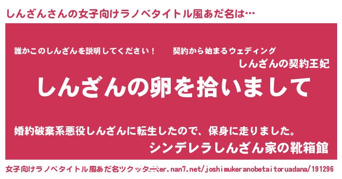 | 男性向けラノベタイトル風あだ名 | 『しんざんの嫁は女の子じゃないと思った?』 |