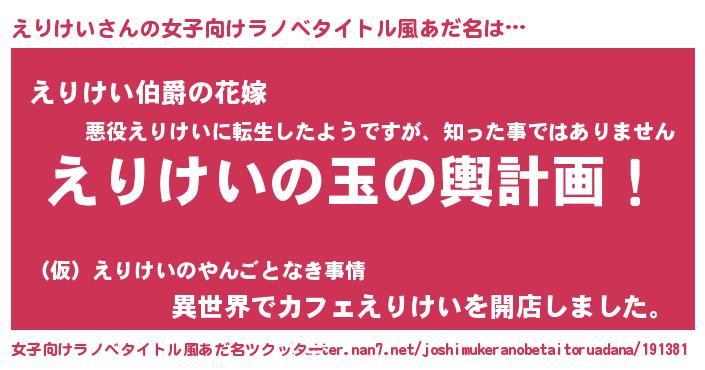 | 男性向けラノベタイトル風あだ名 | 『転生したらえりけいだった件』 |