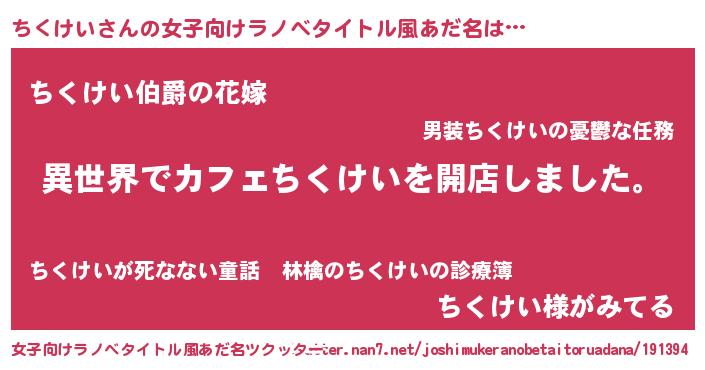 | 男性向けラノベタイトル風あだ名 | 『誰もが恐れるあのちくけいが、ぼくの専属メイドになるようです。』 |
