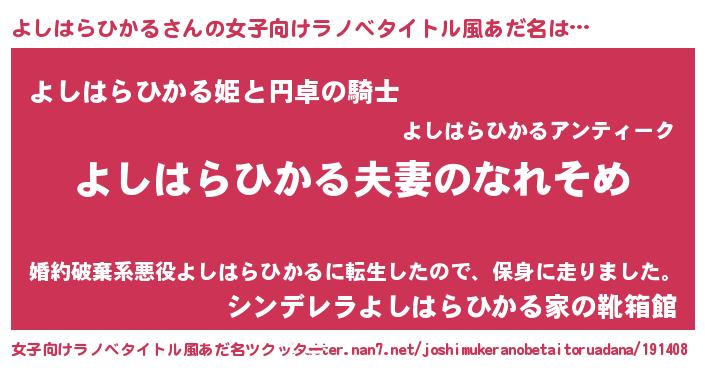 | 男性向けラノベタイトル風あだ名 | 『おまえをオタクにしてやるから、俺をよしはらひかるにしてくれ! 』 |