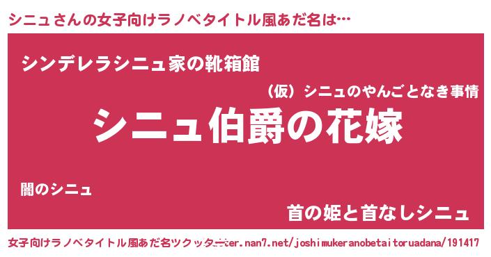 | 男性向けラノベタイトル風あだ名 | 『やはりシニュの青春ラブコメはまちがっている 』 |