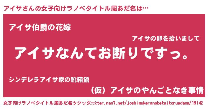 | 男性向けラノベタイトル風あだ名 | 『魔法科高校のアイサ』『アイサの憂鬱』 |