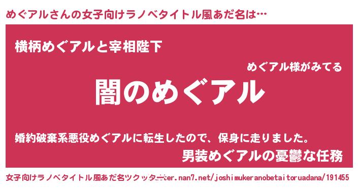 | 男性向けラノベタイトル風あだ名 | 『Re:めぐアルから始める異世界生活』 |