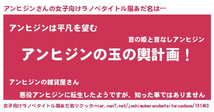 | 男性向けラノベタイトル風あだ名 | 『アンヒジン~年齢イコール彼女いない歴の魔法使い~』 |