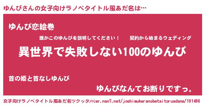 | 男性向けラノベタイトル風あだ名 | 『ゆんびという概念が存在しない退屈な世界 』 |