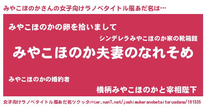 | 男性向けラノベタイトル風あだ名 | 『おまえをオタクにしてやるから、俺をみやこほのかにしてくれ! 』 |