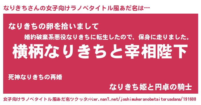 | 男性向けラノベタイトル風あだ名 | 『なりきちに滅ぼされるだけの簡単なお仕事です』 |