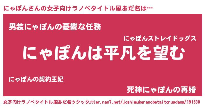 | 男性向けラノベタイトル風あだ名 | 『ダンジョンににゃぽんを求めるのは間違っているだろうか』 |
