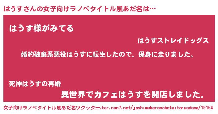 | 男性向けラノベタイトル風あだ名 | 『転生したらはうすだった件』 |
