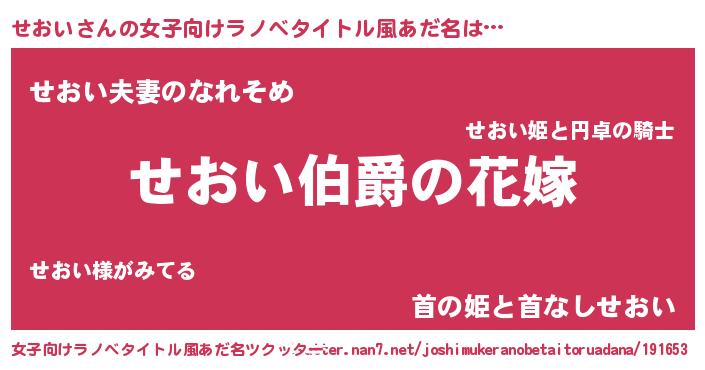 | 男性向けラノベタイトル風あだ名 | 『うちの娘の為ならば、俺はもしかしたらせおいも倒せるかもしれない。』 |