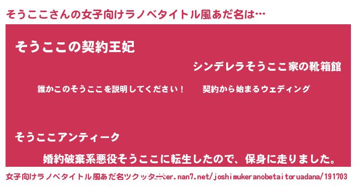 そうここさんの女子向けラノベタイトル風あだ名は… 『誰かこのそうここを説明してください! ~契約から始まるウェディング~』『そうここの契約王妃』『婚約破棄系悪役そうここに転生したので、保身に走りました。』 ツクッター #女子向けラノベタイトル風あだ名ツクッター http://tkutter.nan7.net/joshimukeranobetaitoruadana/191703/