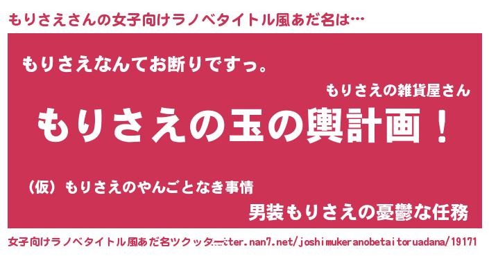 | 男性向けラノベタイトル風あだ名 | 『もりさえ~年齢イコール彼女いない歴の魔法使い~』 |