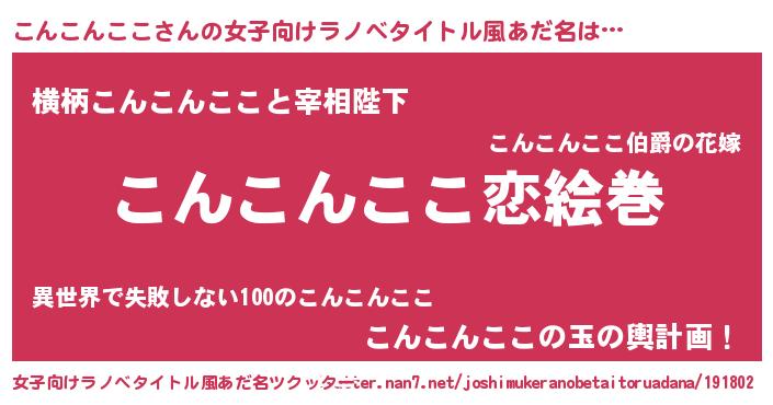 | 男性向けラノベタイトル風あだ名 | 『おまえをオタクにしてやるから、俺をこんこんここにしてくれ! 』 |