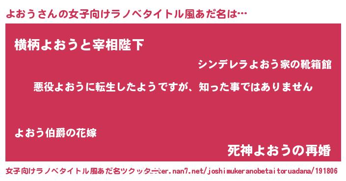 | 男性向けラノベタイトル風あだ名 | 『この素晴らしい世界によおうを!』 |