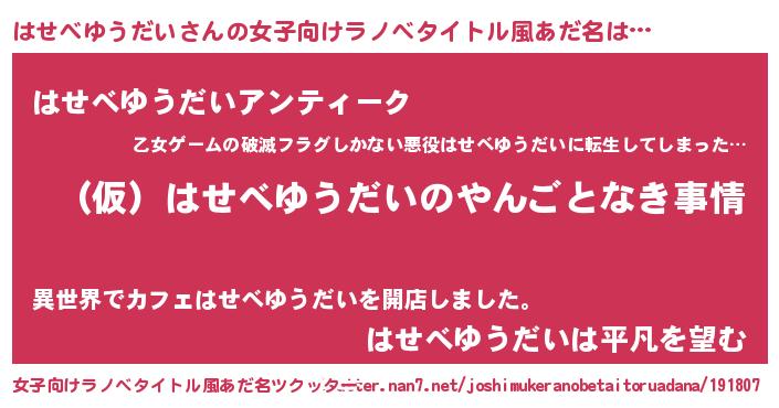 | 男性向けラノベタイトル風あだ名 | 『はせべゆうだいの憂鬱』 |
