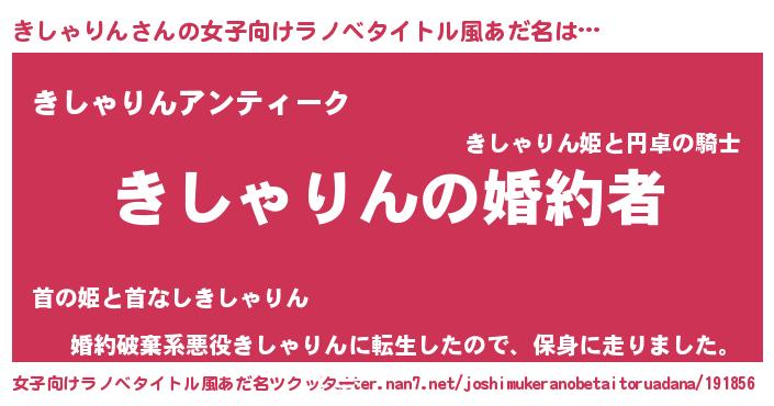 きしゃりんさんの女子向けラノベタイトル風あだ名は… 『きしゃりんの婚約者』『きしゃりんアンティーク』『婚約破棄系悪役きしゃりんに転生したので、保身に走りました。』 ツクッター #女子向けラノベタイトル風あだ名ツクッター http://tkutter.nan7.net/joshimukeranobetaitoruadana/191856/