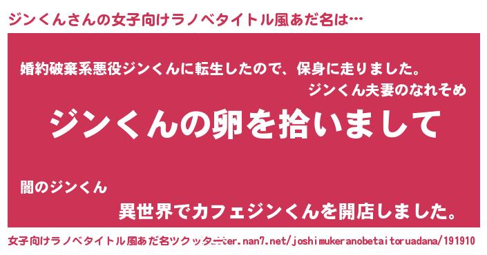 | 男性向けラノベタイトル風あだ名 | 『ジンくんの嫁は女の子じゃないと思った?』 |