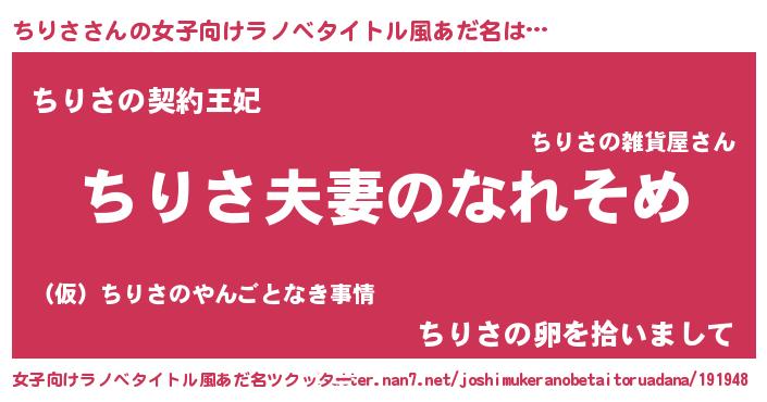 | 男性向けラノベタイトル風あだ名 | 『おまえをオタクにしてやるから、俺をちりさにしてくれ! 』 |