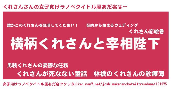 | 男性向けラノベタイトル風あだ名 | 『くれさんに滅ぼされるだけの簡単なお仕事です』 |