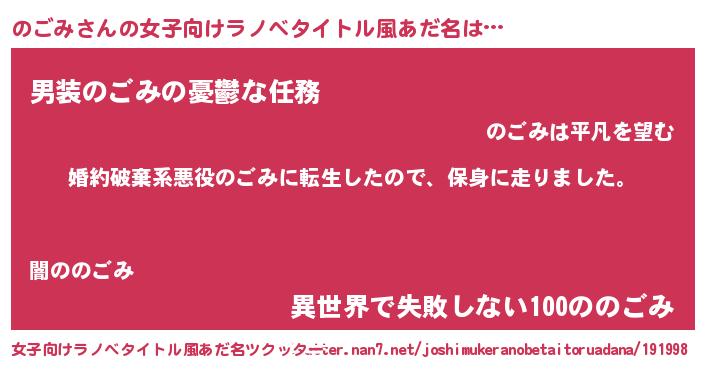 | 男性向けラノベタイトル風あだ名 | 『ノゴミスレイヤー』 |