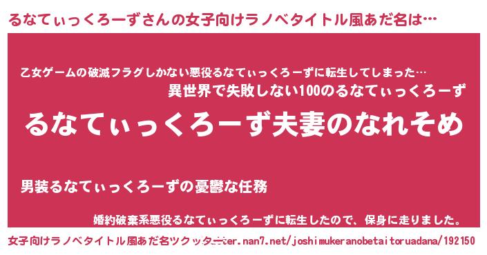 | 男性向けラノベタイトル風あだ名 | 『おまえをオタクにしてやるから、俺をるなてぃっくろーずにしてくれ! 』 |