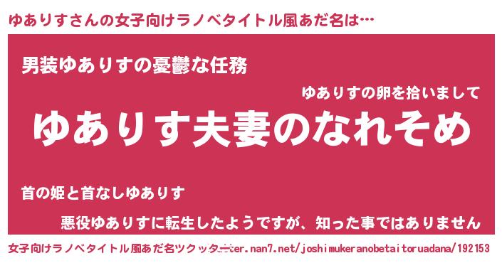 | 男性向けラノベタイトル風あだ名 | 『おまえをオタクにしてやるから、俺をゆありすにしてくれ! 』 |