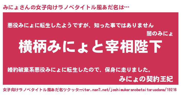 | 男性向けラノベタイトル風あだ名 | 『みにょに滅ぼされるだけの簡単なお仕事です』 |