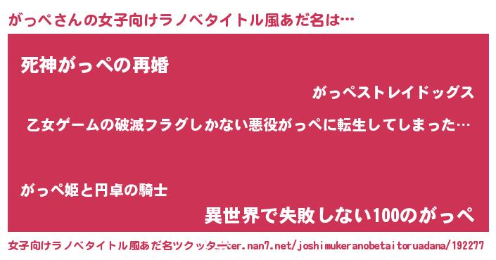 | 男性向けラノベタイトル風あだ名 | 『この素晴らしい世界にがっぺを!』 |