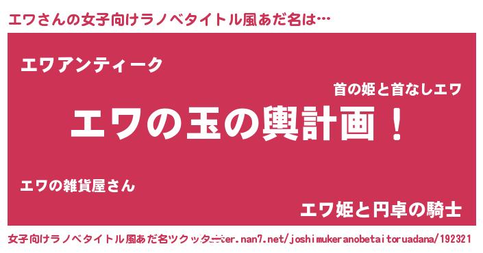 | 男性向けラノベタイトル風あだ名 | 『エワ~年齢イコール彼女いない歴の魔法使い~』 |
