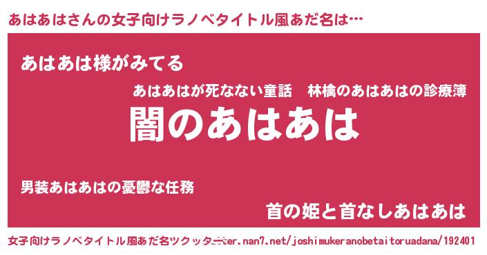 | 男性向けラノベタイトル風あだ名 | 『Re:あはあはから始める異世界生活』 |