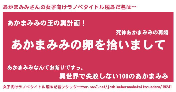 | 男性向けラノベタイトル風あだ名 | 『あかまみみの嫁は女の子じゃないと思った?』 |