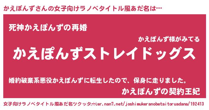 | 男性向けラノベタイトル風あだ名 | 『Re:かえぽんずから始める異世界生活』 |