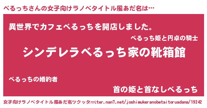 べるっちさんの女子向けラノベタイトル風あだ名は… 『シンデレラべるっち家の靴箱館』『異世界でカフェべるっちを開店しました。』『首の姫と首なしべるっち』 ツクッター #女子向けラノベタイトル風あだ名ツクッター http://tkutter.nan7.net/joshimukeranobetaitoruadana/19242/