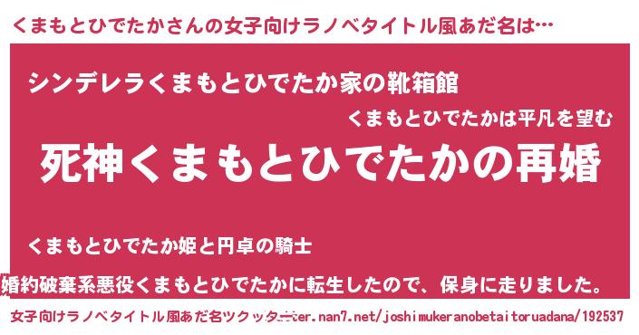 くまもとひでたかさんの女子向けラノベタイトル風あだ名は… 『死神くまもとひでたかの再婚』『シンデレラくまもとひでたか家の靴箱館』『婚約破棄系悪役くまもとひでたかに転生したので、保身に走りました。』 ツクッター #女子向けラノベタイトル風あだ名ツクッター http://tkutter.nan7.net/joshimukeranobetaitoruadana/192537/