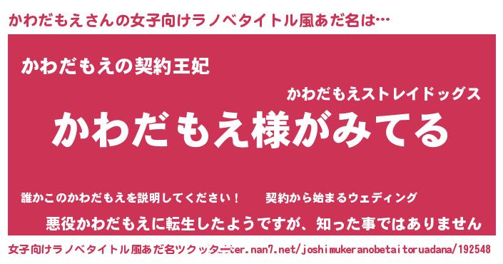 | 男性向けラノベタイトル風あだ名 | 『かわだもえの嫁は女の子じゃないと思った?』 |