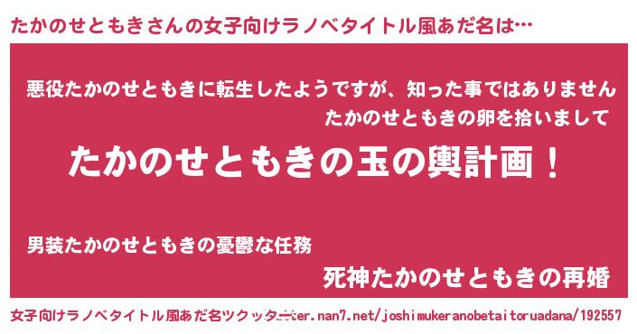 | 男性向けラノベタイトル風あだ名 | 『転生したらたかのせともきだった件』 |