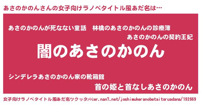 | 男性向けラノベタイトル風あだ名 | 『Re:あさのかのんから始める異世界生活』 |