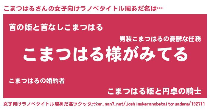 | 男性向けラノベタイトル風あだ名 | 『こまつはるの嫁は女の子じゃないと思った?』 |