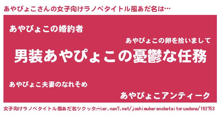 | 男性向けラノベタイトル風あだ名 | 『うちのあやぴょこが世界を掌握している!』 |