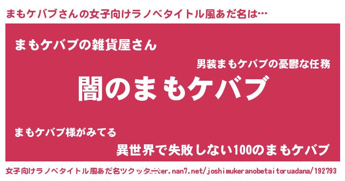 | 男性向けラノベタイトル風あだ名 | 『Re:まもケバブから始める異世界生活』 |