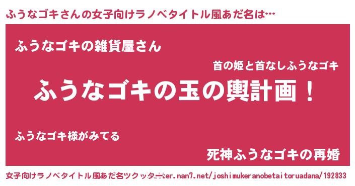 | 男性向けラノベタイトル風あだ名 | 『ふうなゴキ~年齢イコール彼女いない歴の魔法使い~』 |