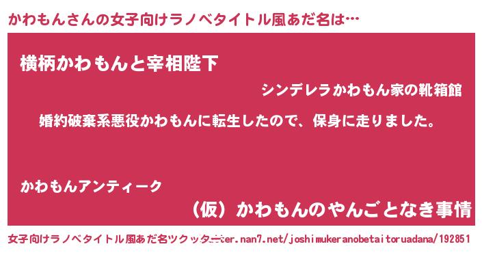 | 男性向けラノベタイトル風あだ名 | 『転生したらかわもんだった件』 |