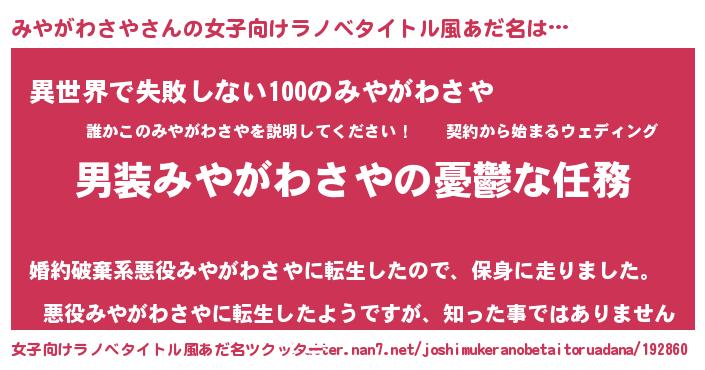 | ヘコむあだ名 | 『みやがわさや(笑)』『みやふぇ~』 |