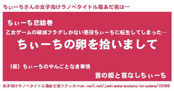 | 男性向けラノベタイトル風あだ名 | 『ちぃーちの嫁は女の子じゃないと思った?』 |