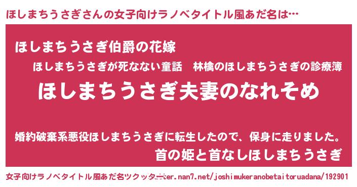 | 男性向けラノベタイトル風あだ名 | 『おまえをオタクにしてやるから、俺をほしまちうさぎにしてくれ! 』 |