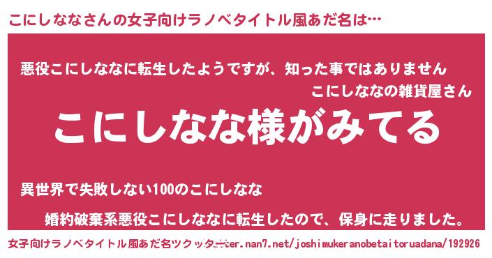 | 男性向けラノベタイトル風あだ名 | 『こにしななの嫁は女の子じゃないと思った?』 |