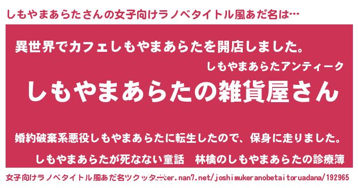 | 男性向けラノベタイトル風あだ名 | 『やはりしもやまあらたの青春ラブコメはまちがっている 』 |