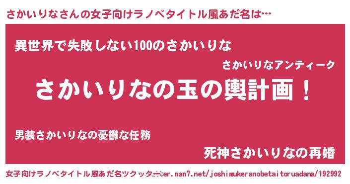 | 男性向けラノベタイトル風あだ名 | 『さかいりな~年齢イコール彼女いない歴の魔法使い~』 |