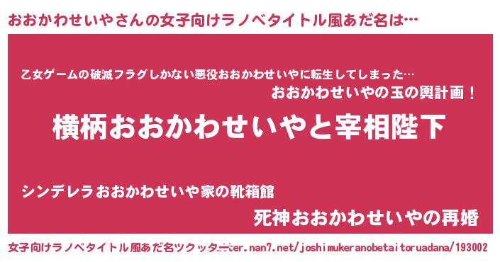 | 胡散臭い通販商品みたいなあだ名 | 『あなたにだけ特別に提供する世界で10本だけ現存している希少なブランデー…その名も「おおかわせいや」』 |