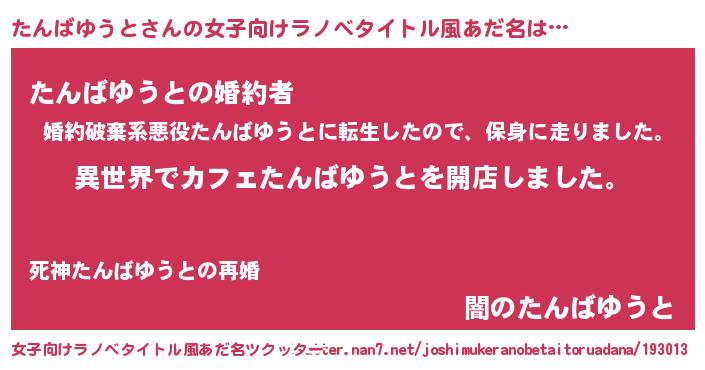 たんばゆうとさんの女子向けラノベタイトル風あだ名は… 『異世界でカフェたんばゆうとを開店しました。』『たんばゆうとの婚約者』『闇のたんばゆうと』 ツクッター #女子向けラノベタイトル風あだ名ツクッター http://tkutter.nan7.net/joshimukeranobetaitoruadana/193013/
